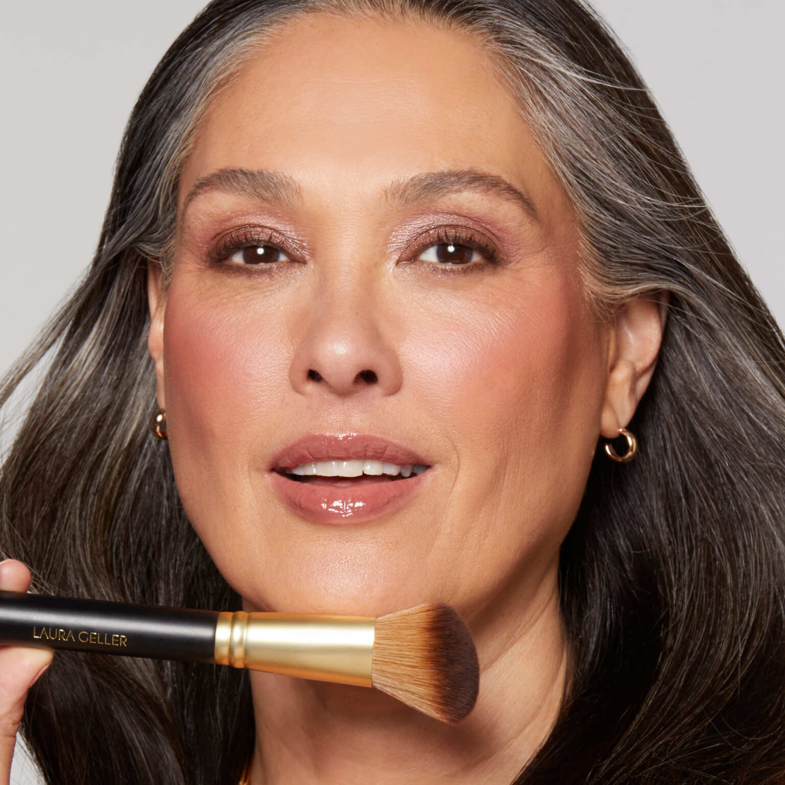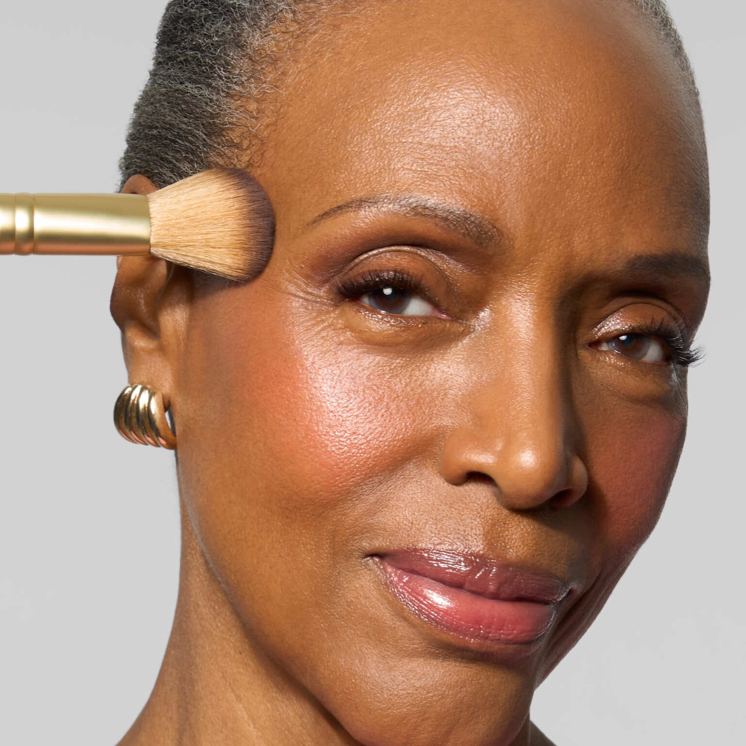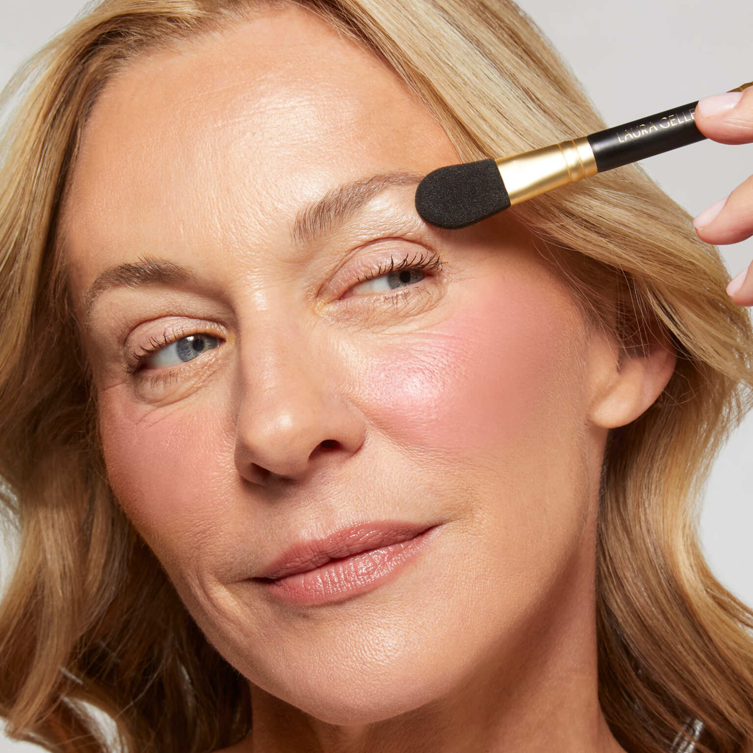 Brush the highlighter all over for a smooth, healthy-looking glow. Follow by sweeping the blush over the apples of your cheeks, blending up and out.