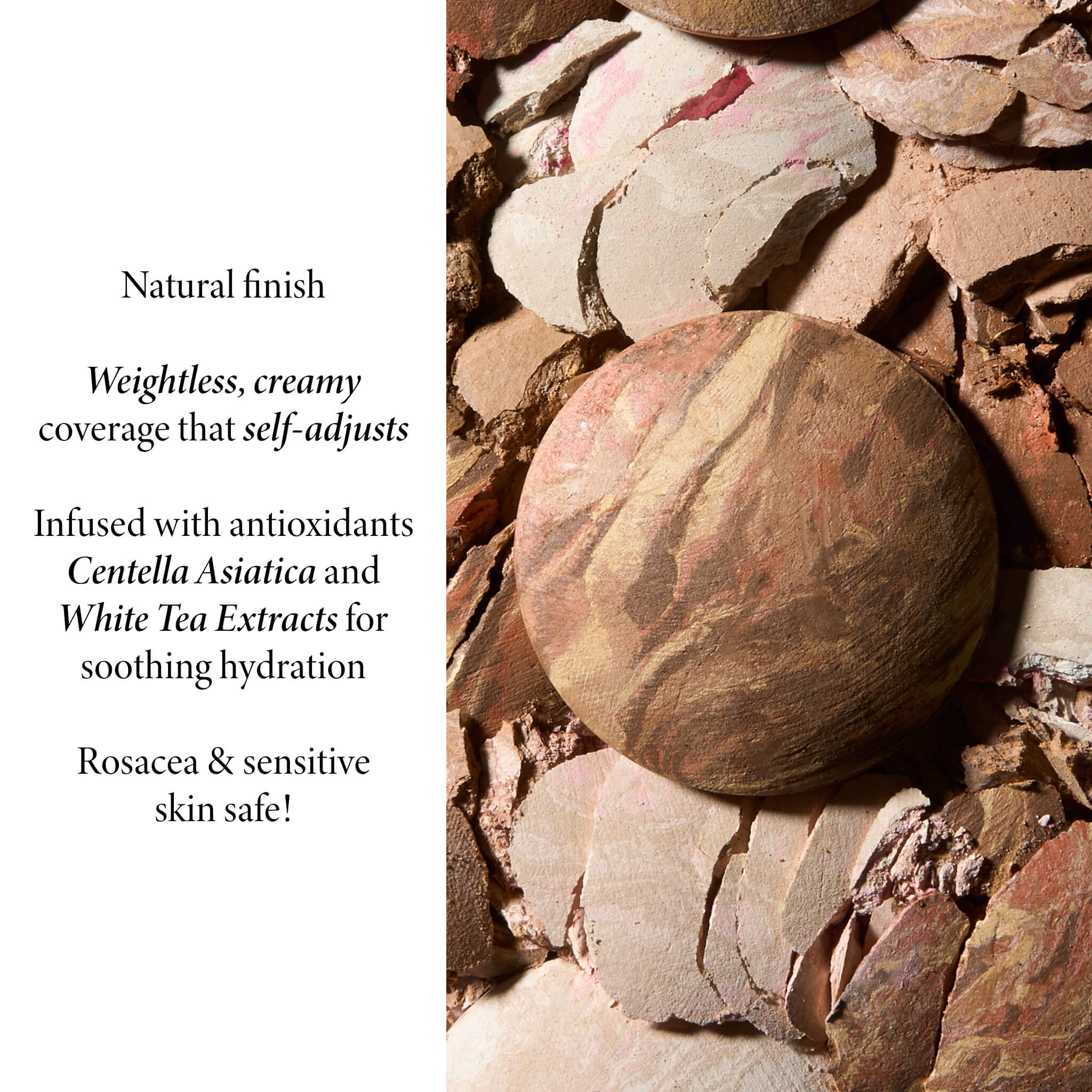 - Swirls of marbleized pigments make shade matching a breeze