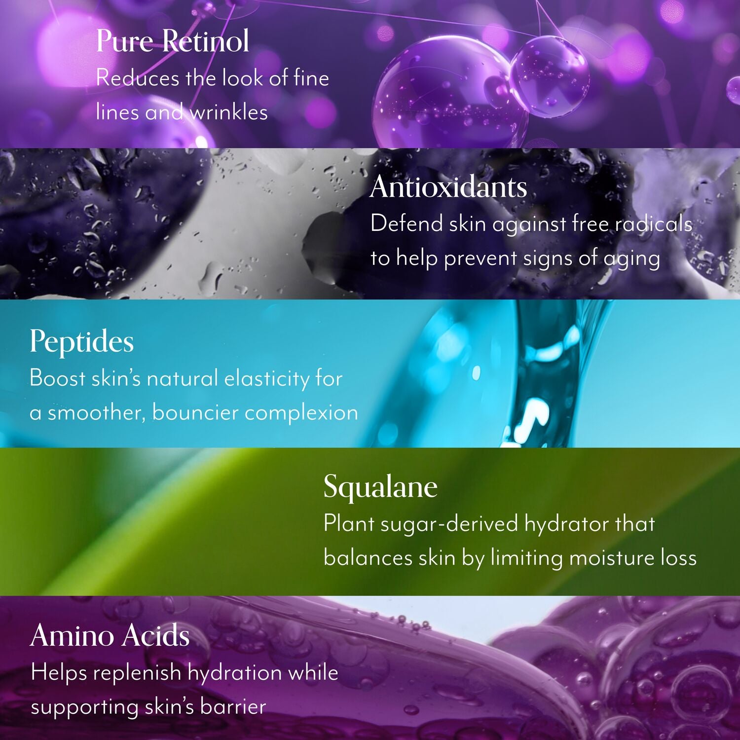 - Pure Retinol: Stabilized retinol helps reduce the look of fine lines and wrinkles and smooths uneven texture.